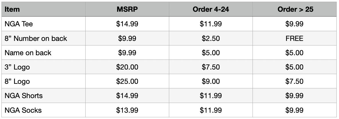 Use the product tables that follow below to select the items you wish to order for your kit. Use the 'Customize' button to add logos, numbers, or names to each jersey.