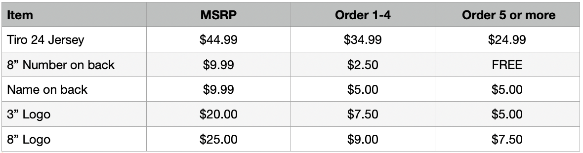 Use the product tables that follow below to select the items you wish to order for your kit. Use the 'Customize' button to add logos, numbers, or names to each jersey.