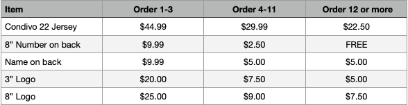 Use the product tables that follow below to select the items you wish to order for your kit. Use the 'Customize' button to add logos, numbers, or names to each jersey.